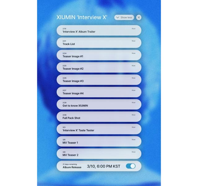 프로모션 스케줄러는 기다렸던 소식을 전하는 휴대폰 메시지 알림 형태로 제작돼 팬들에게 설렘을 안겼다. 스케줄러에 따르면 시우민 미니 2집 '인터뷰 X' 앨범 트레일러를 시작으로 트랙리스트와 총 4개 버전의 티저 이미지, '겟 투 노우 시우민(Get to Know XIUMIN)' '풀 팩 샷(Full Pack Shot)' '인터뷰 X' 테이스트 티저, 뮤직비디오 티저 등 다양한 콘텐츠들이 준비돼 있다.