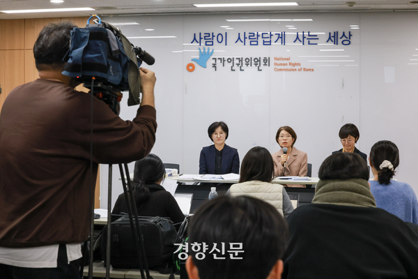 원민경 국가인권위원회 비상임위원·남규선 상임위원·소라미 비상임위원(왼쪽부터)이 지난 11일 서울 중구 인권위원회에서 ‘위헌·위법적인 비상계엄을 옹호하는 의결의 철회와 국가인권위원회 위원장의 사퇴를 촉구한다’는 기자회견을 하고 있다. 이준헌 기자 |