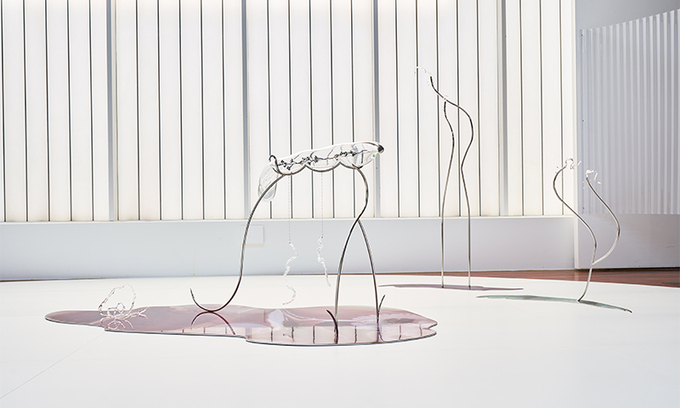 ‘딱 걸린 진화의 현장’은 인간에 의하여 파괴된 세상 너머 디스토피아에 관한 긍정적 공상을 드러낸다. 신비로운 복잡성과 우연성으로 점철된 자연의 순환체계 내에서 인간과 비인간, 유기물과 무기물이 조화롭게 공존하는 풍경을 빚어냄으로써다. “제 작업의 주요 소재인 유리는 시간을 머금고 흐르고, 금속은 불 속에서 녹았다가 다시 굳습니다. 그 변형의 과정에서 저는 기억과 감각을 물질로 옮깁니다. 인간이 사라진 후에도 다시 태어날 생명과 의식. 저는 조각을 통해 그것들을 형상화하고자 했습니다. 모든 것이 사라진 이후, 그것은 더 깊고 조용한 서사의 시작입니다.” 인류의 종말은 지구상 또 다른 생명체의 번영을 위한 비움이 되어줄 터이기에 그렇다.