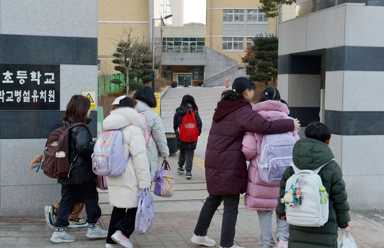 고 김하늘양 피살 사건 후 긴급 휴교령이 내려졌던 대전의 한 초등학교 학생들이 17일 학부모와 함께 등교하고 있다. 이날 당정은 고위험 교원에 대한 신속하고 적극적인 개입을 통해 긴급분리, 직권 휴·면직 등 강력한 조처를 제도화하기로 했다.