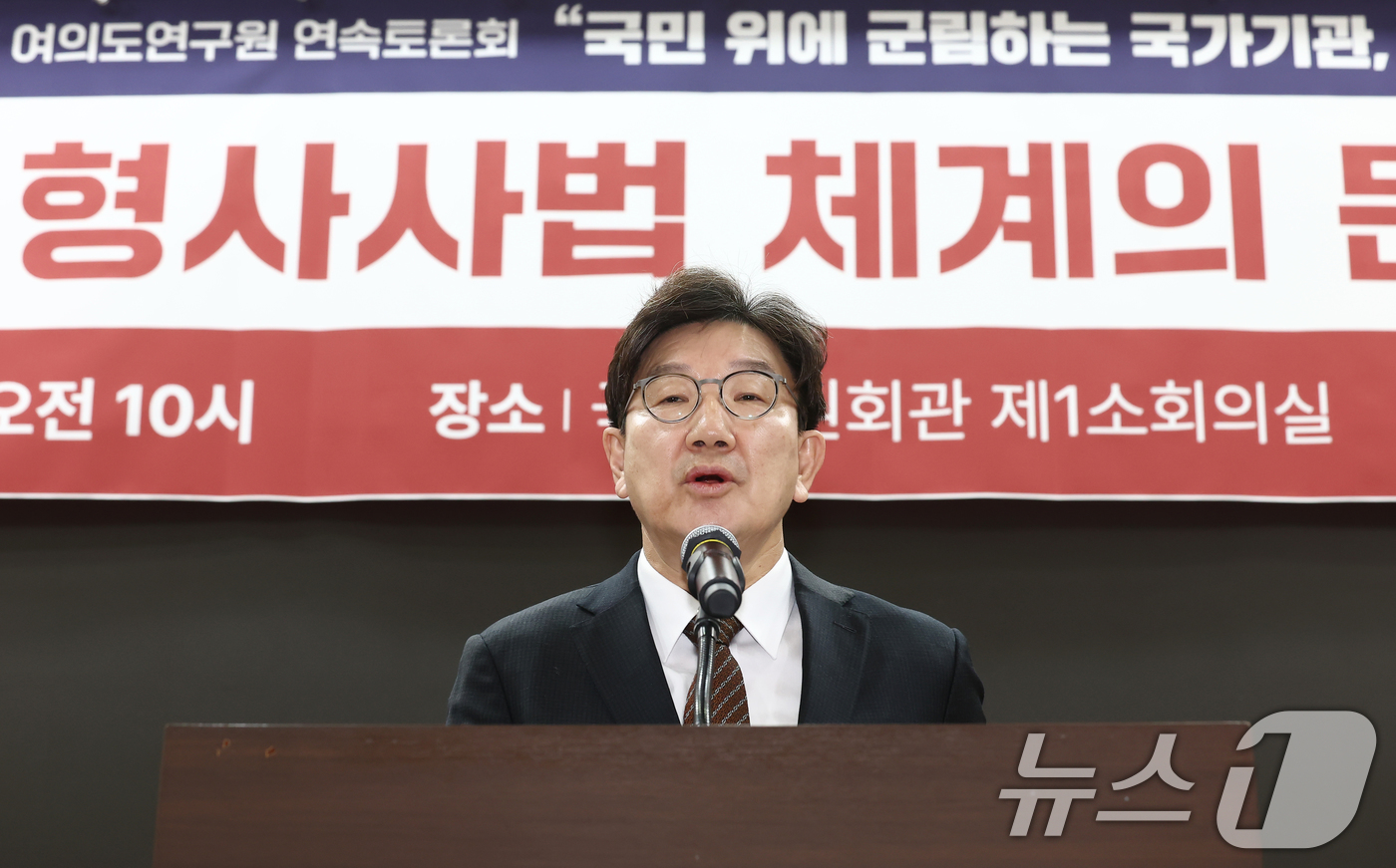 권성동 국민의힘 원내대표가 18일 오전 서울 여의도 국회 의원회관에서 열린 '창립 30주년 여의도연구원 연속토론회, 국민 위에 군림하는 국가기관 정상인가?'에서 축사를 하고 있다. 2025.2.18/뉴스1 ⓒ News1 김민지 기자 |