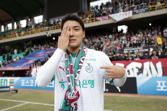 대전하나시티즌 주민규가 15일 포항스틸야드에서 열린 2025 K리그1 1라운드 포항 스틸러스와의 원정 경기에서 3-0으로 승리한 뒤 세레머니하고 있다. K리그 제공 |