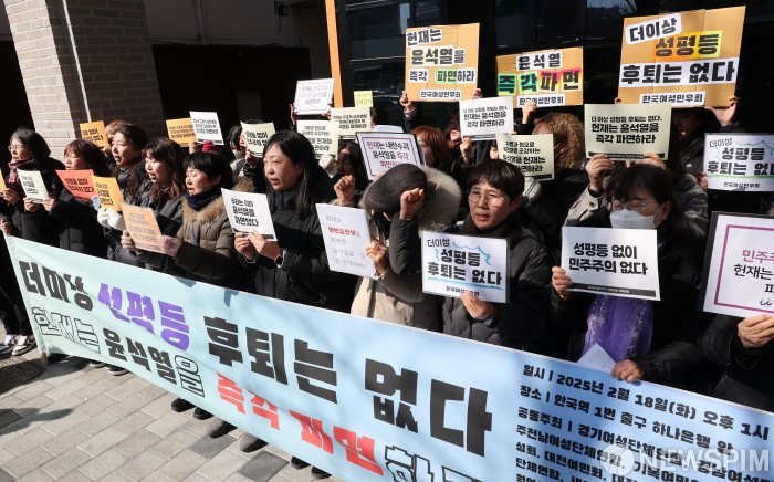 [서울=뉴스핌] 김학선 기자 = 한국여성단체연합 회원들이 18일 서울 종로구 안국역 앞에서 '더이상 성평등 후퇴는 없다. 헌법재판소는 윤석열을 즉각 파면하라' 기자회견을 열고 있다. 2025.02.18 yooksa@newspim.com