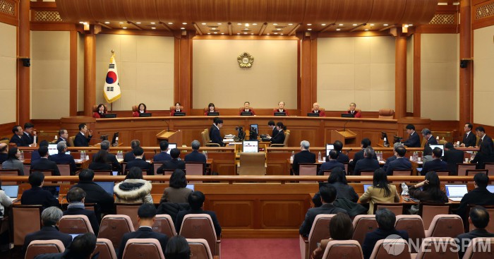[서울=뉴스핌] 사진공동취재단 = 문형배 헌법재판소장 권한대행을 비롯한 재판관들이 18일 서울 종로구 헌법재판소에서 열린 윤석열 대통령 탄핵심판 9차 변론기일에 참석하고 있다. 2025.02.18 photo@newspim.com