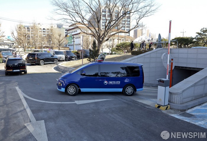 [서울=뉴스핌] 사진공동취재단 = 18일 서울 종로구 헌법재판소에서 '윤석열 대통령 탄핵심판 9차 변론'이 열린 가운데 윤 대통령 호송차량이 헌법재판소를 나서고 있다. 2025.02.18 photo@newspim.com