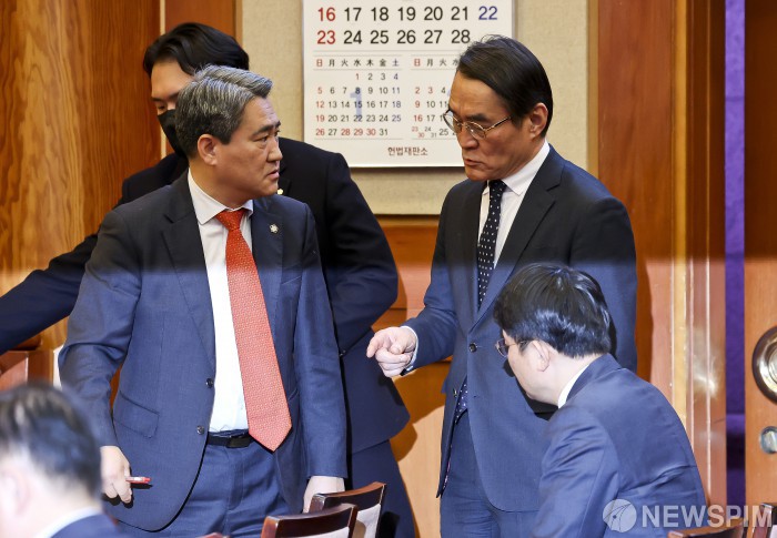 [서울=뉴스핌] 사진공동취재단 = 윤석열 대통령측 변호인들이 18일 서울 종로구 헌법재판소에서 열린 '윤석열 대통령 탄핵심판 9차 변론'에 출석해 대화를 나누고 있다. 2025.02.18 photo@newspim.com
