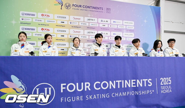 [OSEN=박준형 기자] 18일 오후 서울 목동 실내빙상장 앞 기자회견장에서 2025 ISU 사대륙 피겨 선수권대회 출전 한국 선수단 미디어데이 행사가 진행됐다.