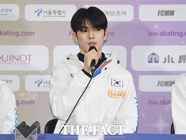 [더팩트ㅣ장윤석 기자] '2025 ISU(국제빙상연명) 사대륙 피겨스케이팅 선수권 대회 한국팀 미디어데이'가 18일 오후 서울 양천구 목동실내빙상장에서 열린 가운데 차준환이 소감을 밝히고 있다.