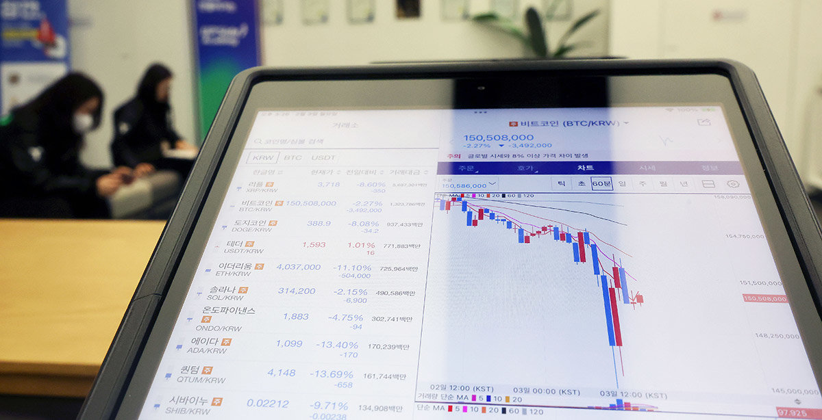 관세 전쟁 여파로 비트코인 가격이 10만 달러 밑으로 급락한 가운데 3일 서울 강남구 업비트 고객센터 태블릿에 비트코인 차트가 급락되어 있다. 2025.02.03 서울=뉴시스 |