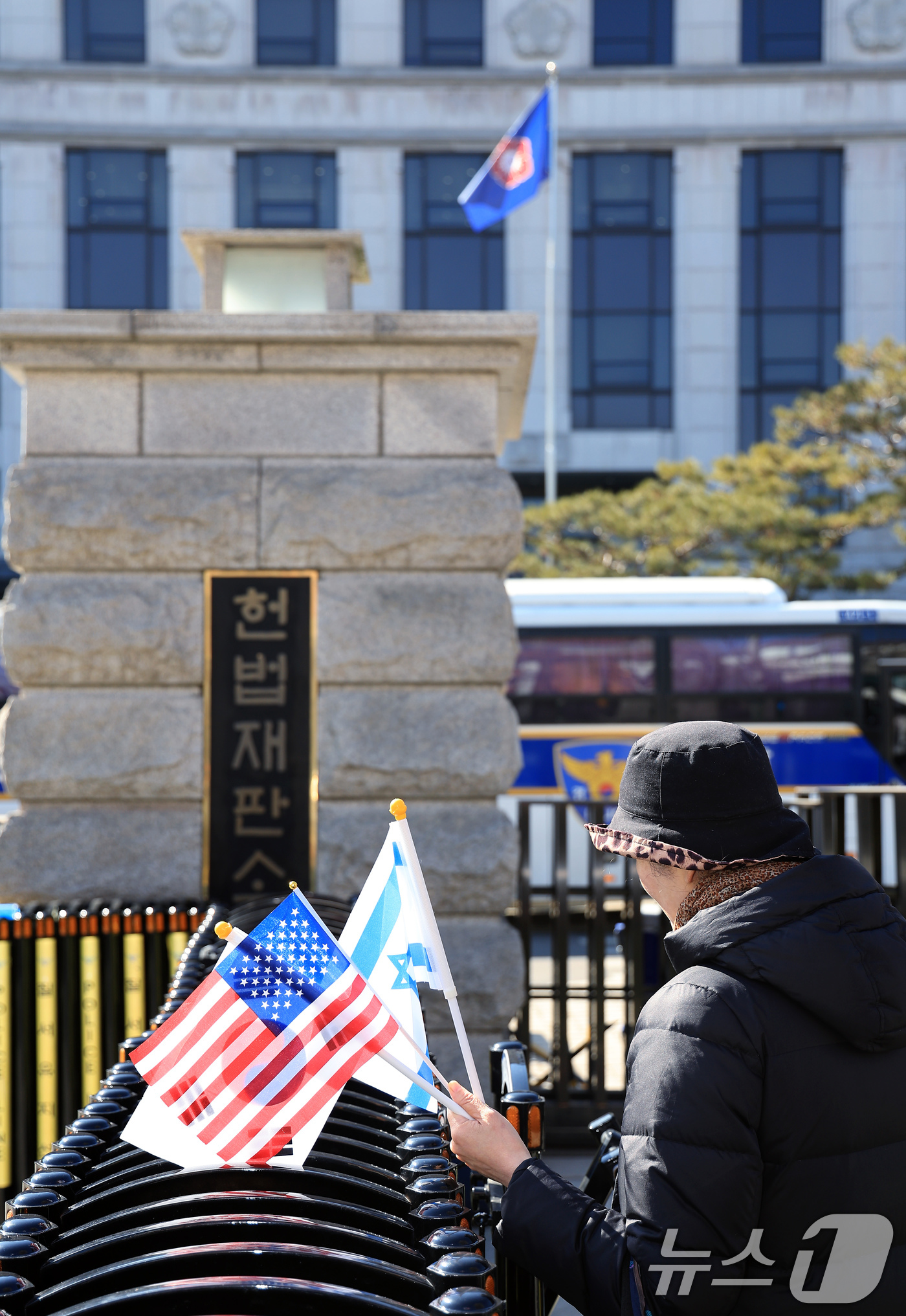 (서울=뉴스1) 박정호 기자 = 윤석열 대통령 탄핵심판 10차 변론을 하루 앞둔 19일 오후 서울 종로구 재동 헌법재판소 앞에서 태극기와 성조기, 이스라엘 국기를 든 시민이 경찰 질서유지선 앞에서 기도하고 있다. 헌법재판소는 내일 10차 변론을 마지막으로 증인 심문을 마친 뒤, 다음 주 중 최종 변론을 진행할 것으로 보인다. 2025.2.19/뉴스1