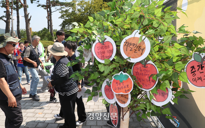 민주노총 공공운수노조 조합원들이 지난해 9월 서울 용산구 대통령실 앞에서 열린 ‘공공부문 비정규직 차별 해소 촉구 추석 한마당’에서 노동 현장별 요구사항이 적힌 손팻말을 소원나무에 걸고 있다. 정지윤 선임기자 |