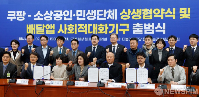 [서울=뉴스핌] 윤창빈 기자 = 박찬대 더불어민주당 원내대표, 박대준 쿠팡 대표를 비롯한 참석자들이 19일 오후 서울 여의도 국회에서 열린 쿠팡-소상공인·민생단체 상생협약식 및 배달앱 사회적대화기구 출범식에서 기념촬영을 하고 있다. 2025.02.19 pangbin@newspim.com