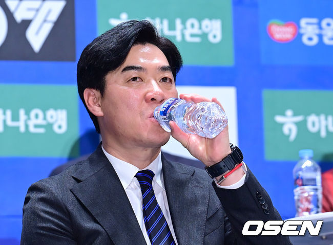 [OSEN=김성락 기자] 19일 오후 서울 마포구 상암 누리꿈스퀘어에서 2025 K리그2 개막 미디어데이 행사가 열렸다. 행사에는 올 시즌 K리그2에 참가하는 14개 팀 감독과 대표 선수가 참석, 1부 승격을 향한 각오를 밝힌다. 인천 윤정환 감독이 물을 마시고 있다. 2025.02.19 / ksl0919@osen.co.kr |