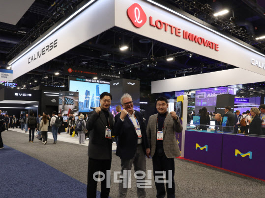 (왼쪽부터)김동규 칼리버스 대표, 닐 트레빗 엔비디아 부사장, 김경엽 롯데이노베이트 대표가 ‘CES2025’ 칼리버스 부스에서 기념촬영을 하고 있다(사진=롯데이노베이트) |