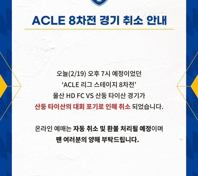 울산은 19일 공식채널을 통해 "19일 오후 7시 예정됐던 ACLE 리그 스테이지 8차전이 산둥의 대회 포기로 취소됐다"고 발표했다.