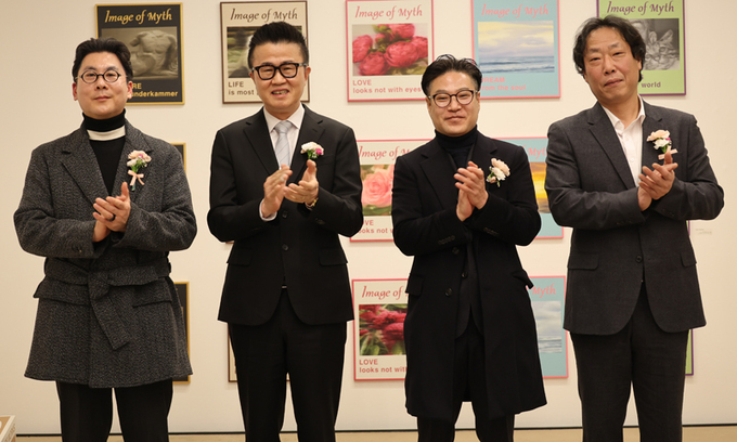 19일 서울 종로구 학고재 아트센터에서 열린 세계일보 창간 36주년 기념 세계미술전에서 정희택 세계일보 사장 등 주요 관계자들이 기념촬영을 하고 있다. 왼쪽부터 정영한 작가, 정희택 세계일보 사장, 이홍원 미술평론가, 임완수 아트인뱅크 대표. 이제원 선임기자 |