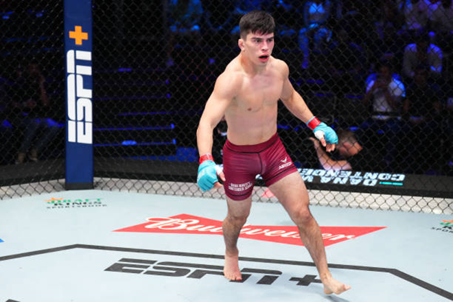 케빈 바셰호스가 2024년 9월 UFC 데이나 화이트 회장이 직접 주최하는 컨텐더 시리즈 시즌8 7주차 페더급 경기 승리 후 기뻐하고 있다. 사진=TKO |