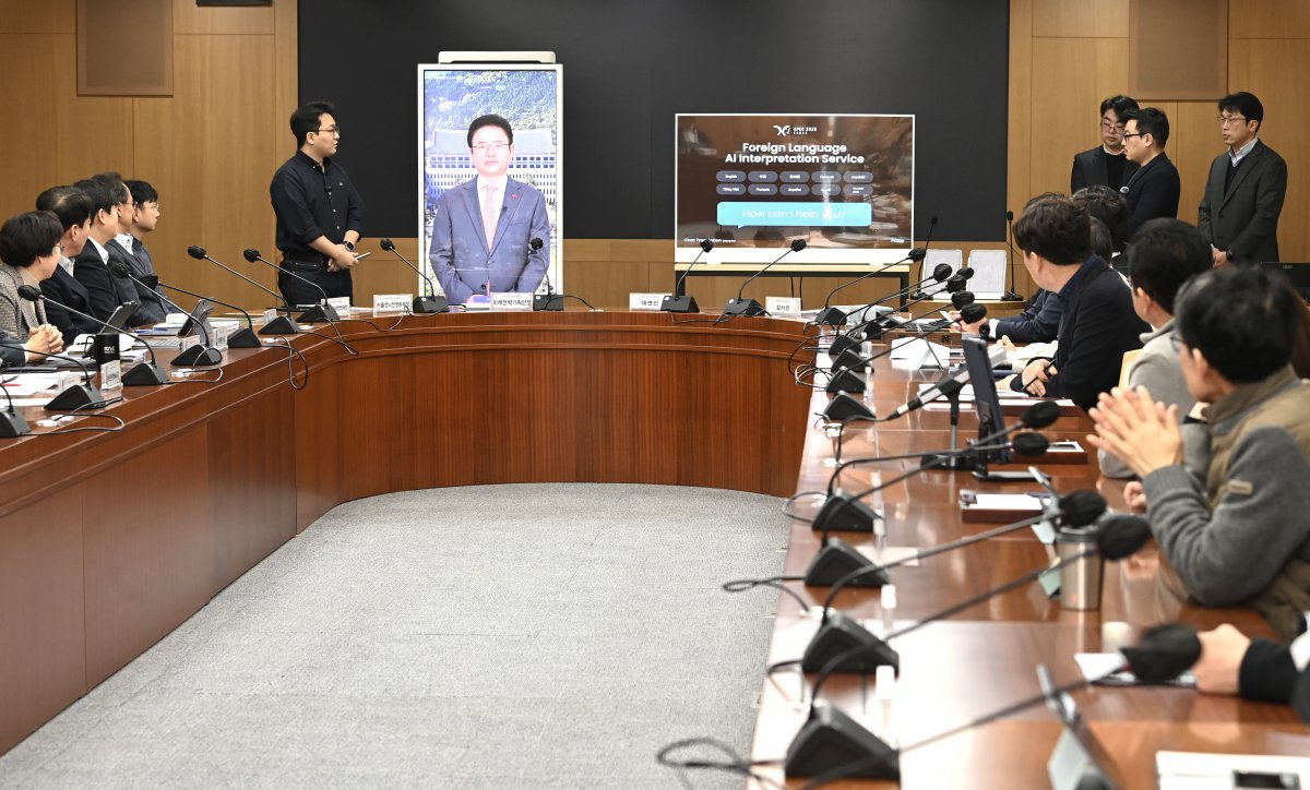18일 경북 안동시 도청 회의실에서 진행된 SOM1 준비 회의에서 AI 종합 안내 서비스 기기가 시연되고 있다. 경북도 제공 |