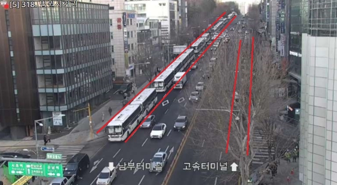 이날 오전 서울시 교통정보에 따르면 서초중앙로(법원검찰청↔서초구립반포도서관), 반포대로(서울성모병원↔서초역, 교대입구↔서초역), 서초대로(서초역↔법원검찰청) 하위차선이 통제되고 있다.