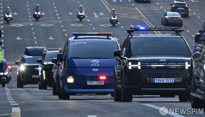 [서울=뉴스핌] 사진공동취재단 = 윤석열 대통령이 탑승한 호송차가 20일 오전 서울 서초구 서초역사거리에서 서울중앙지법으로 향하고 있다. 서울중앙지법 형사합의25부는 이날 내란 우두머리 혐의를 받는 윤 대통령의 1차 공판준비기일을 진행하며, 이번 기일에서는 윤 대통령 측이 청구한 구속 취소에 대한 심문도 함께 진행될 예정이다. 2025.02.20 photo@newspim.com