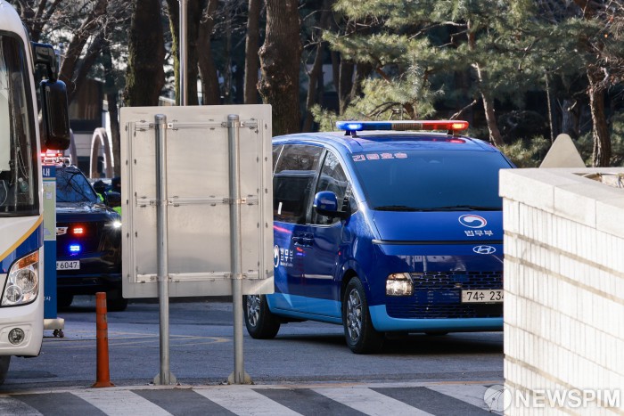 [서울=뉴스핌] 사진공동취재단 = 내란 우두머리 혐의를 받는 윤석열 대통령의 형사재판 첫 공판준비기일인 20일 윤 대통령이 탄 법무부 호송차량이 서초구 서울중앙지법으로 들어서고 있다. 2025.02.20 photo@newspim.com