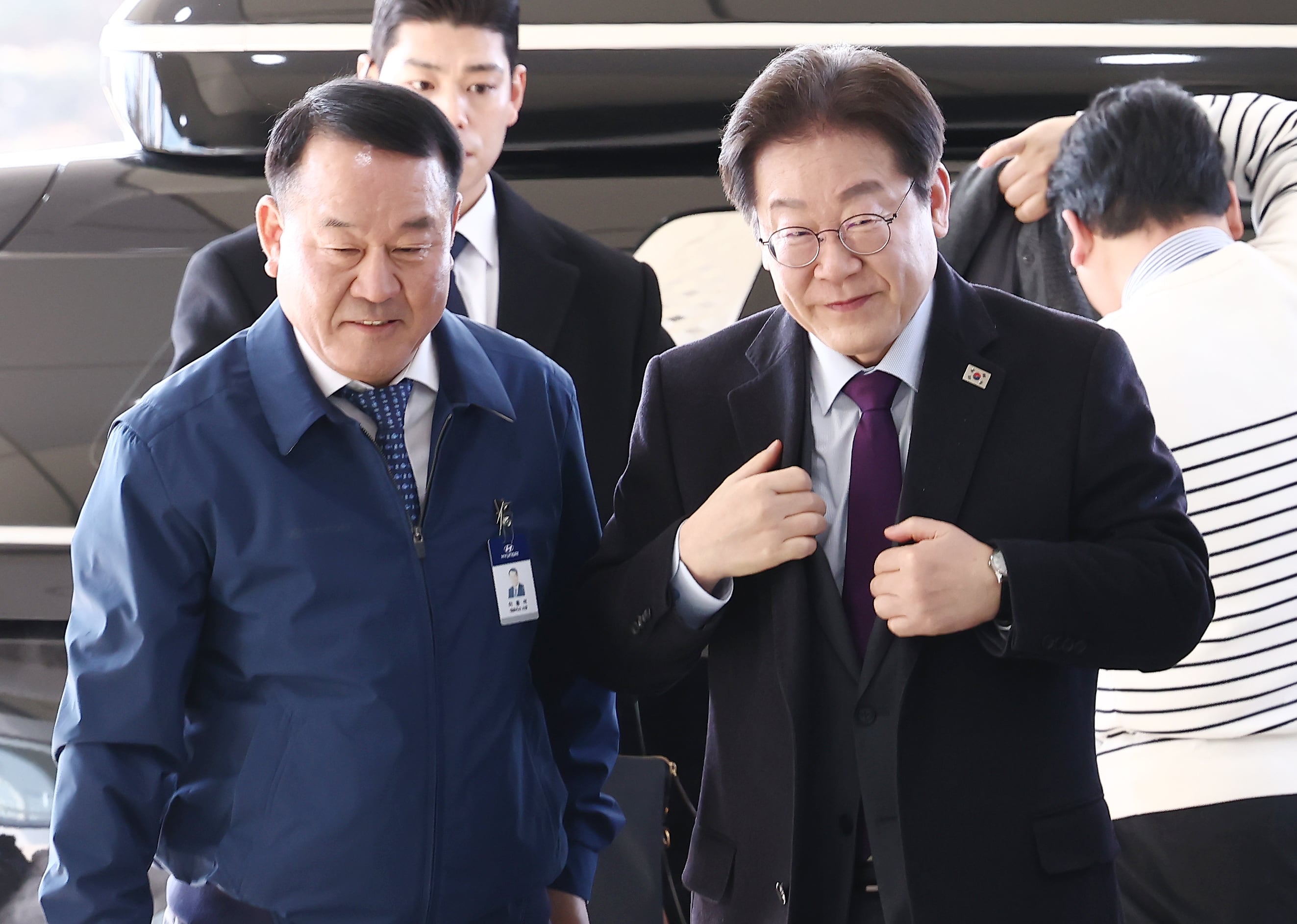 이재명 더불어민주당 대표가 20일 오전 충남 아산시 현대자동차 아산공장을 방문해 이동석 사장과 들어서고 있다./뉴스1 |