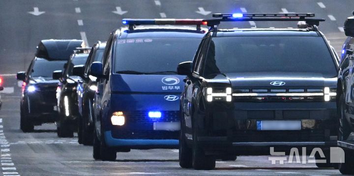 [서울=뉴시스] 김근수 기자 = 내란 우두머리' 혐의로 재판에 넘겨진 윤석열 대통령의 첫 형사재판이 열리는 20일 오전 윤 대통령 탑승 호송차량 행렬이 서울 서초구 서울중앙지방법원으로 향하고 있다. 2025.02.20. ks@newsis.com |
