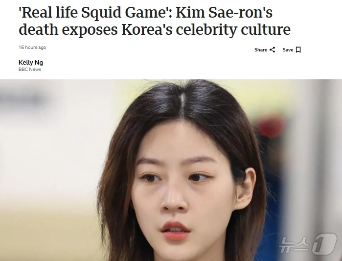(서울=뉴스1) 박형기 기자 = 한국 배우 김새론의 죽음은 한국 연예계 자체가 넷플릭스 히트작 오징어게임의 실사판이기 때문이라고 영국 BBC가 20일 보도했다.