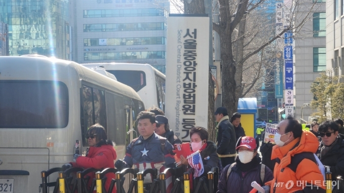 이날 오전 체감온도가 영하 4도까지 떨어지면서 지지자들은 귀마개에 털모자, 마스크, 목도리를 착용하고 패딩 점퍼를 껴입은 모습이었다. 이들은 법원 삼거리 입구에서 '탄핵 무효' 등 문구가 적힌 피켓을 받아들었다.