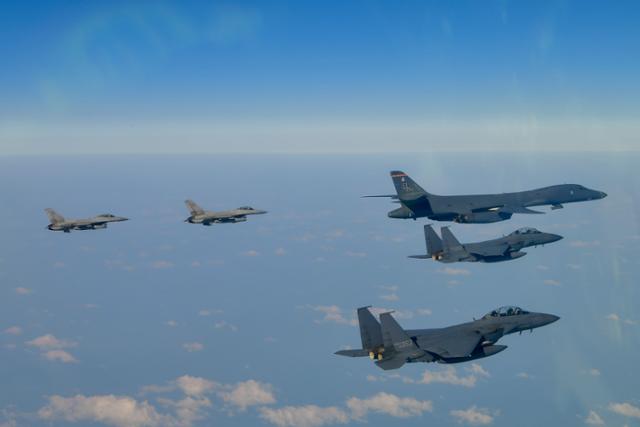 한미 양국이 20일 미국 B-1B 전략폭격기 랜서가 전개한 가운데 올해 첫 연합 공중훈련을 하고 있다. 국방부 제공 |