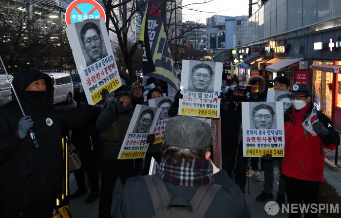 [서울=뉴스핌] 최지환 기자 = 헌법재판소에서 윤석열 대통령 탄핵심판 10차 변론기일이 진행중인 가운데 윤석열 대통령 지지자들이 20일 오후 서울 종로구 문형배 헌법재판소장 권한대행의 자택 앞에서 재판관 사퇴를 촉구하는 퇴근시위를 하고 있다. 2025.02.20 choipix16@newspim.com