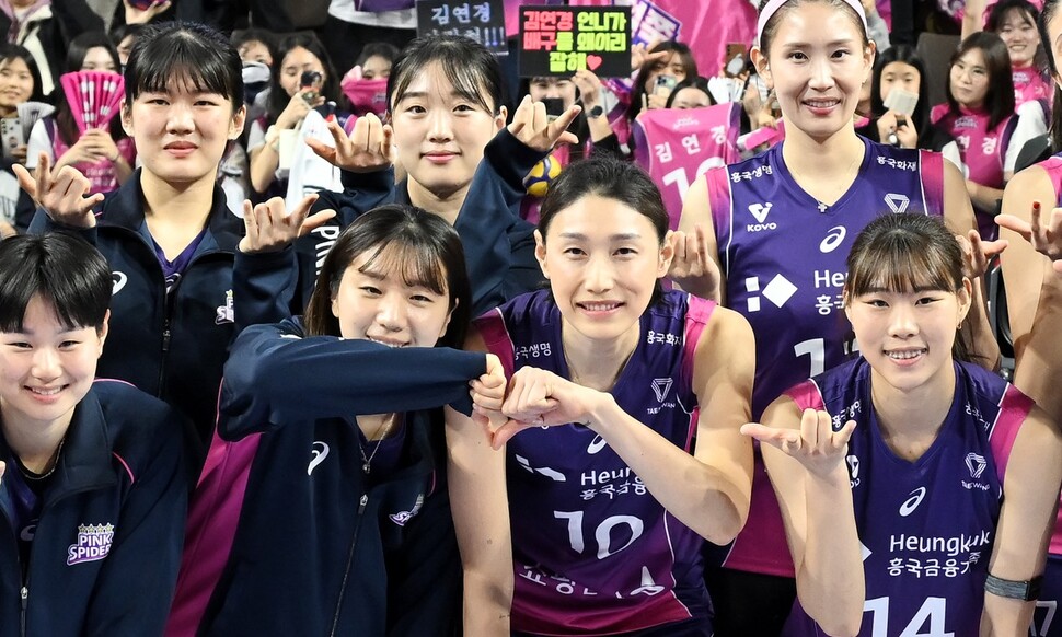 흥국생명 김연경(앞줄 오른쪽에서 두 번째)이 지난 16일 화성종합체육관에서 열린 2024~2025 V리그 여자부 IBK기업은행과 경기가 끝난 뒤 선수들과 함께 사진 촬영에 임하고 있다. 한국배구연맹 제공. |