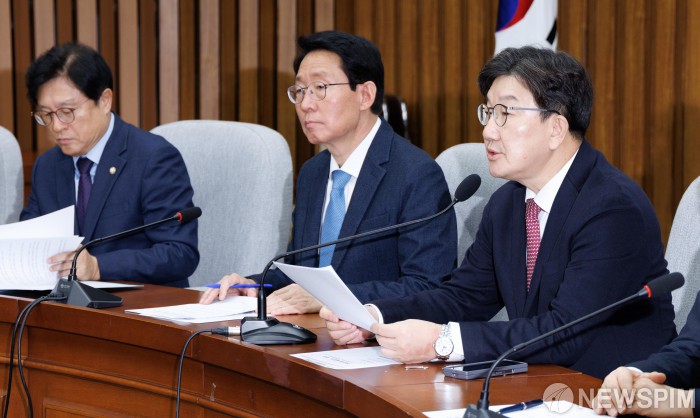 [서울=뉴스핌] 윤창빈 기자 = 권성동 국민의힘 원내대표가 21일 오전 서울 여의도 국회에서 열린 원내대책회의에서 모두발언을 하고 있다. 2025.02.21 pangbin@newspim.com