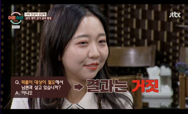 아내 황진주는 ‘당신은 화풀이 대상이 필요해서 남편과 살고 있습니까?’라는 질문에 아니라고 답을 했다. 결과는 거짓으로 나왔다. 이를 들은 아내는 “어떡해”라며 표정 관리를 하지 못했다.