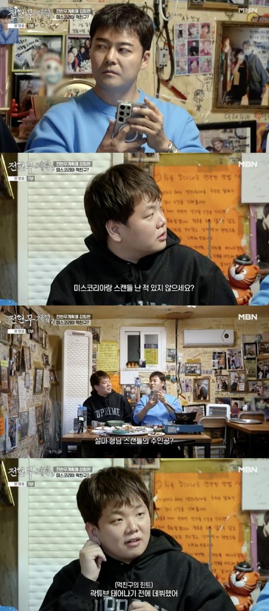 곽튜브는 '먹친구'를 궁금해하다가 최근 전현무와 스캔들이 난 아나운서 홍주연을 언급했고, 전현무는 “걔 미스코리아 아니다”라고 선을 그었다.