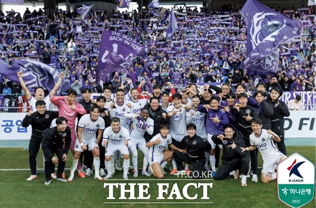 창단 11년 만에 승격의 꿈을 이룬 FC안양은 울산HD와 '하나은행 K리그1 2025' 개막전에서 1-0 승리를 거둔 데 이어 22일 '숙적' FC서울과 2라운드 원정 경기를 펼쳐 관심을 모으고 있다. 사진은 개막전 승리 후 원정 응원단을 배겸으로 기념 사진을 찍는 안양 선수단./K리그 |