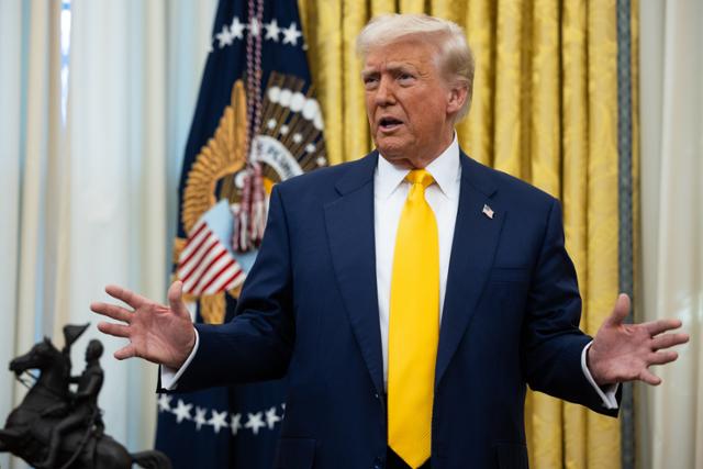 도널드 트럼프 미국 대통령이 21일 백악관에서 열린 하워드 러트닉 미국 상무부장관 취임식에서 기자회견을 가지고 있다. 워싱턴=UPI 연합뉴스 |