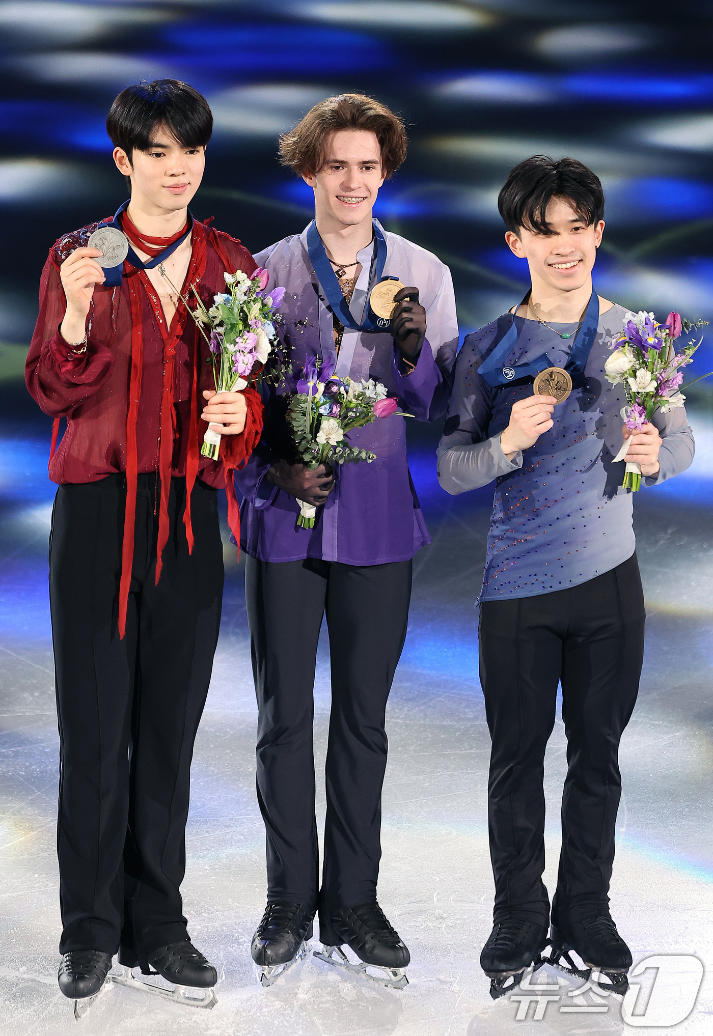 (서울=뉴스1) 김진환 기자 = 22일 오후 서울 양천구 목동 아이스링크에서 열린 2025 ISU 사대륙 피겨스케이팅 선수권대회 남자 싱글 프리스케이팅 시상식에서 2위를 기록한 차준환이 1위 카자흐스탄의 미카일 샤이도로프, 3위 미국의 지미 마와 함께 기념 촬영을 하고 있다. 2025.2.22/뉴스1