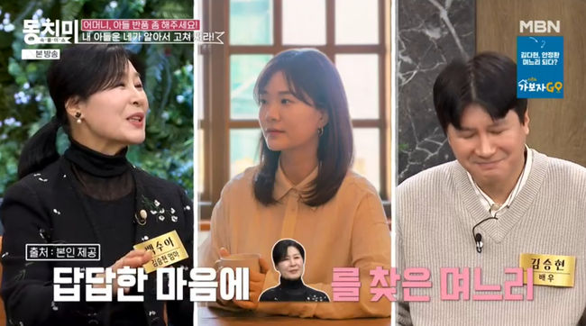 22일 방송된 MBN '속풀이쇼 동치미'에서는 백수아가 아들인 배우 김승현이 이혼 위기를 겪었던 사연을 이야기했다.