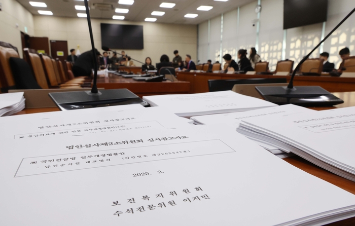 20일 서울 여의도 국회에서 열린 보건복지위원회 제1차 법안심사제2소위원회에 국민연금법 일부개정법률안 자료가 놓여져 있다. [한주형 기자] |