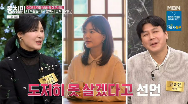 22일 방송된 MBN '속풀이쇼 동치미'에서는 배우 김승현의 어머니 백수아가 아들, 며느리의 이혼 위기를 함께 극복했던 사연을 이야기했다.