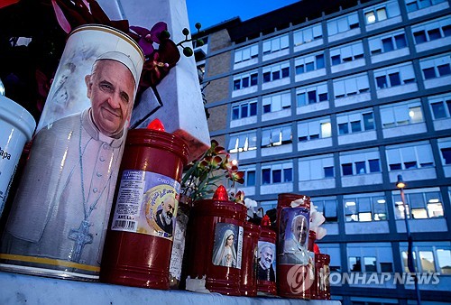 프란치스코 교황의 쾌유를 기도하며 병원 근처를 밝히고 있는 촛불 [EPA 연합뉴스. 재판매 및 DB 금지] |
