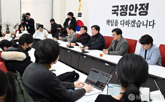 [서울=뉴스핌] 양윤모 기자 = 권성동 국민의힘 원내대표가 23일 오후 서울 여의도 국회에서 기자간담회를 하고 있다. 2025.02.23 yym58@newspim.com