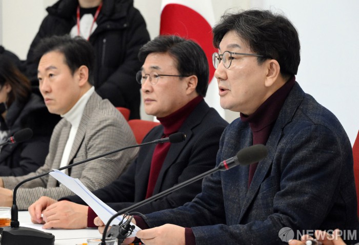 [서울=뉴스핌] 양윤모 기자 = 권성동 국민의힘 원내대표가 23일 오후 서울 여의도 국회에서 기자간담회를 하고 있다. 2025.02.23 yym58@newspim.com