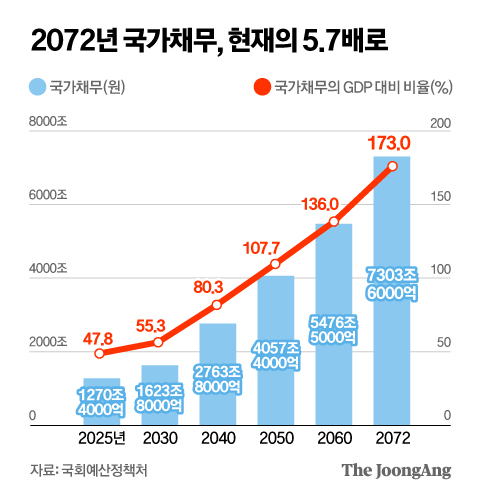 23일 국회예산정책처(예정처)는 ‘2025~2072년 장기재정전망’ 보고서에서 국가채무가 올해 1270조4000억원에서 2072년 7303조6000억원으로 약 5.7배로 늘어난다고 추계했다. 연평균 3.8% 증가하는 수준이다. GDP 대비 국가채무 비율은 올해 47.8%에서 2050년 107.7%, 2072년 173%로 증가한다고 내다봤다.