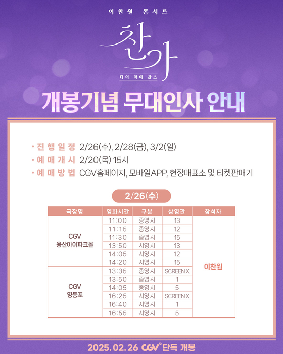 공연의 감동을 스크린으로 다시 만나는 순간에 이찬원과 직접 소통할 기회까지. 팬들과 더욱 가까이에서 호흡하며 잊지 못할 추억을 선사할 무대인사인 만큼 벌써부터 기대를 모은다.