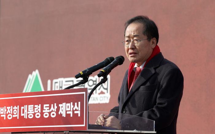 홍준표 대구시장이 23일 오후 동대구역 광장에서 열린 ‘박정희 동상 제막식’에서 인사말하고 있다. 연합뉴스 |