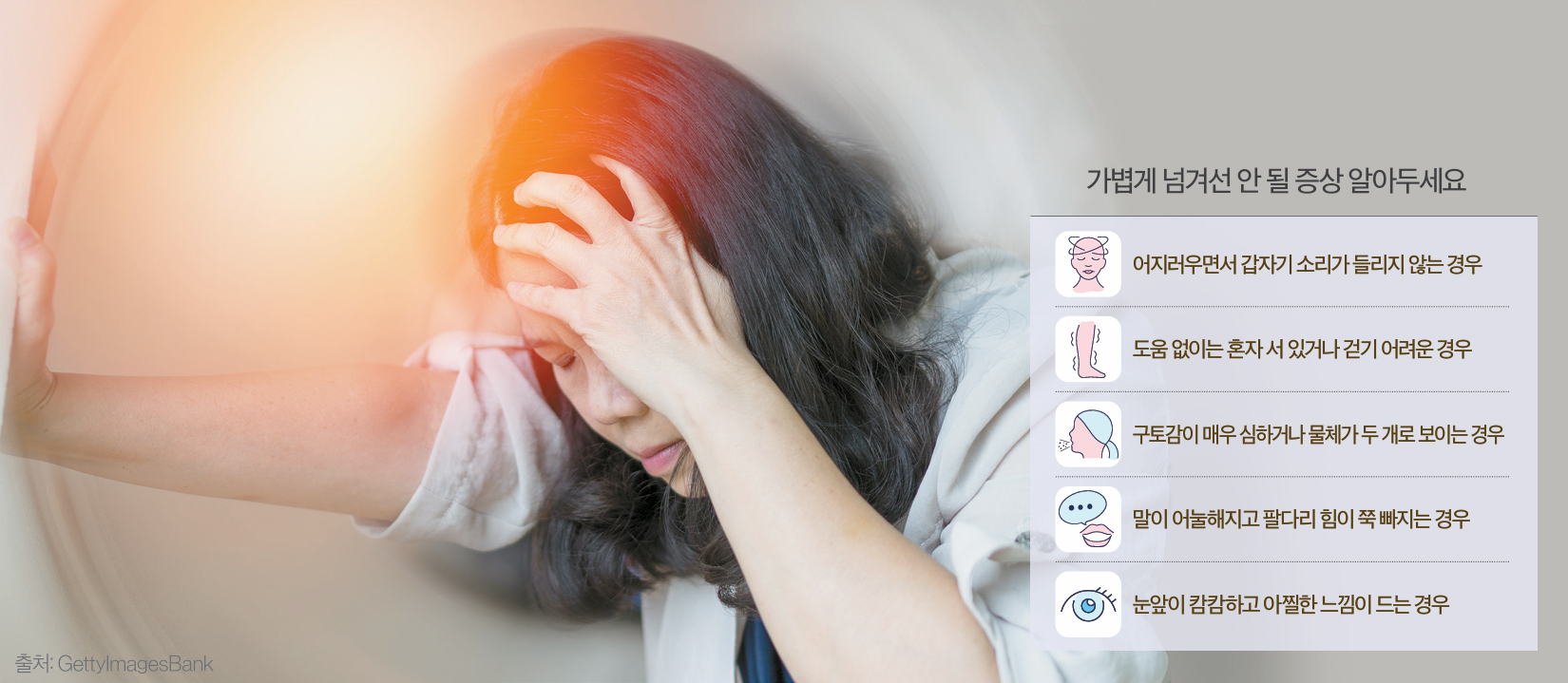 그러나 원인을 정확히 알고 대처하지 않으면 증상이 만성화해 삶의 질이 크게 떨어지거나 중병의 위험 신호를 놓치는 것일 수 있어 주의해야 한다. 가톨릭대 인천성모병원 이비인후과 전은주 교수는 “어지럼증을 단순히 피로나 스트레스 때문으로 치부하기보다 다양한 건강 문제의 신호일 수 있다는 점에서 바라볼 필요가 있다”며 “어지럼증이 반복적으로, 일상생활을 방해할 정도로 나타난다면 정확한 원인을 파악해야 한다”고 했다.