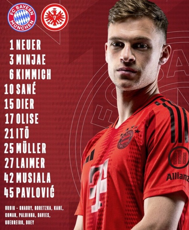 바이에른 뮌헨은 24일 오전 1시 30분(한국시간) 독일 뮌헨에 위치한 알리안츠 아레나에서 열리는 2024-25시즌 분데스리가 23라운드에서 프랑크푸르트와 맞대결을 펼친다.