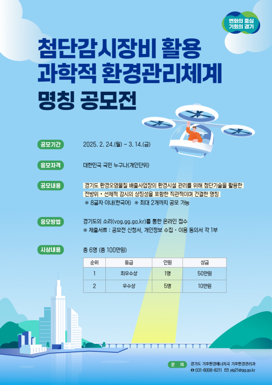 김경호 경기도 기후환경관리과장은 "경기도는 도민의 눈높이에 맞춘 환경관리를 위해 첨단감시장비를 적극 도입해 운영 중"이라며 "명칭 공모에 많은 관심과 참여를 부탁드린다"고 당부했다.
